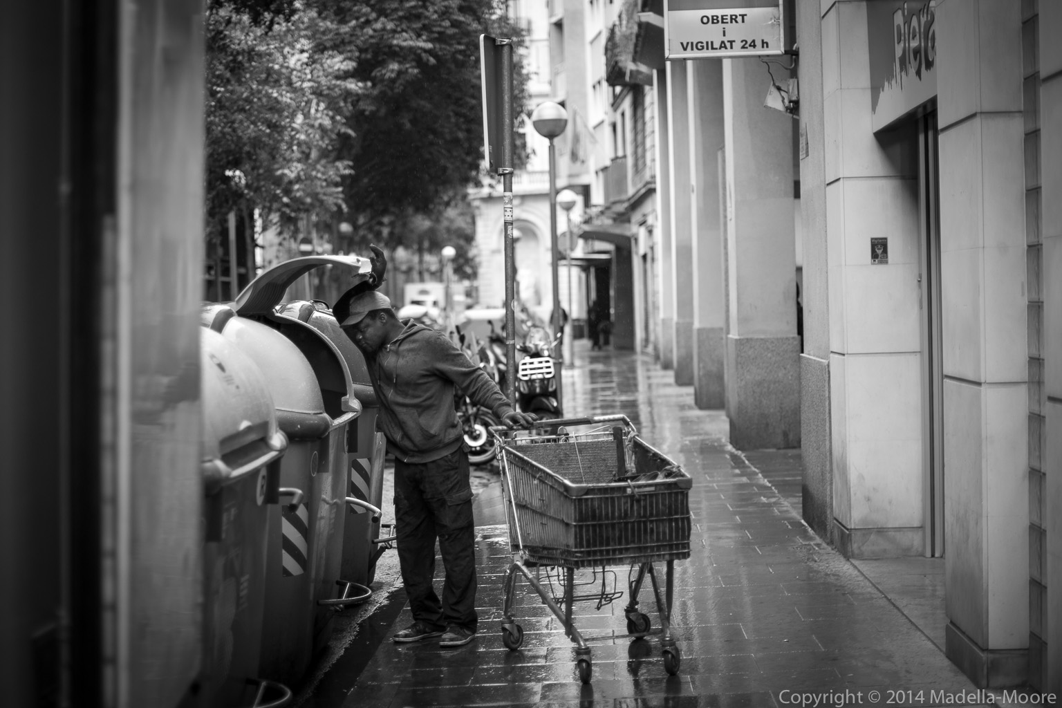 Carrer del Pintor Fortuny, Barcelona. This is quite a common sight – people hunting for scrap metal. This has become a problem for the city council, as the scrap value in part pays for the city-wide recycling system.