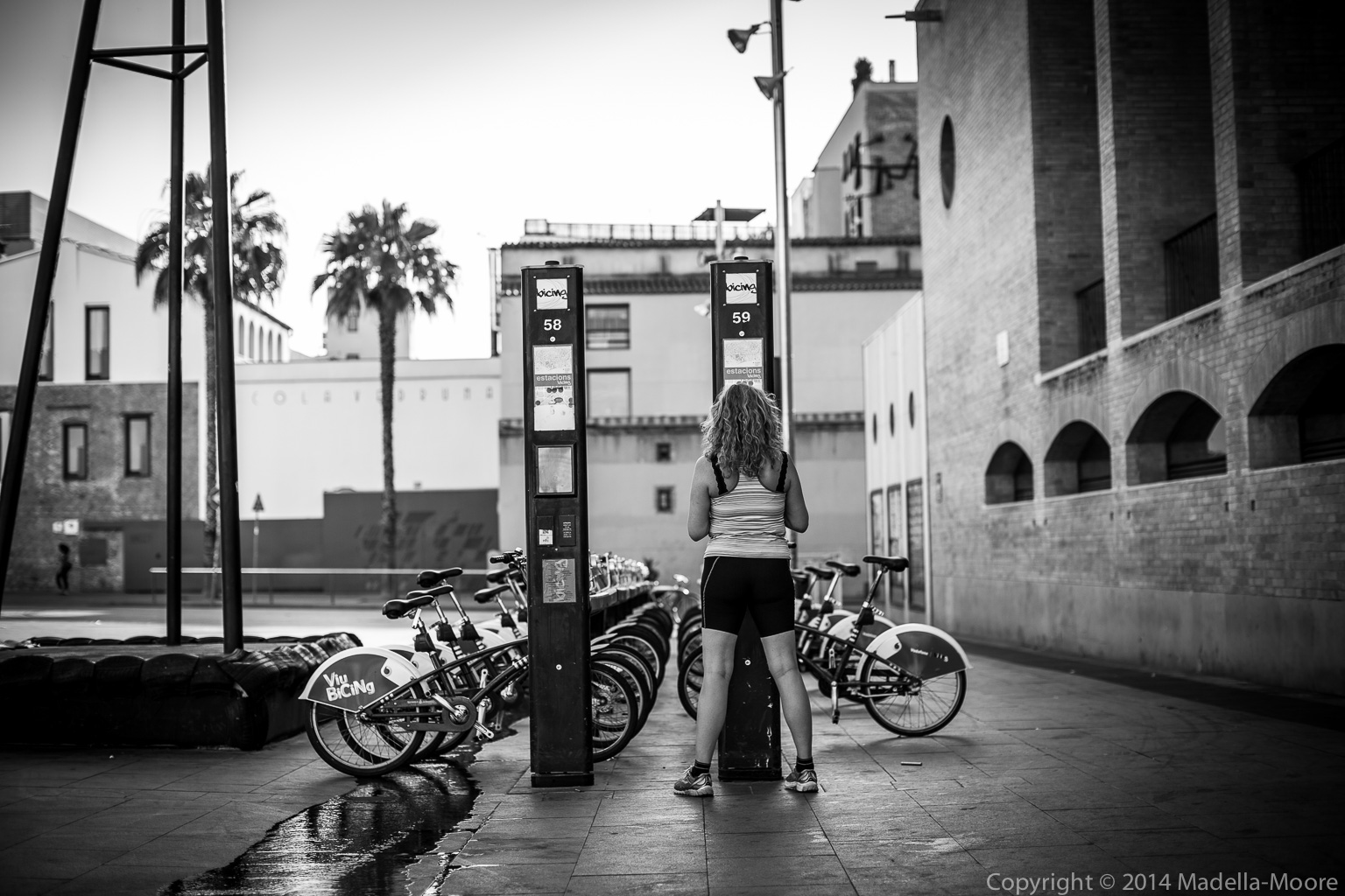 Someone taking out one of the city hire-bikes, Barcelona. Taken with a full-frame DSLR and 50mm lens.