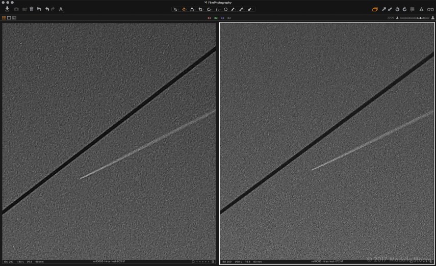While I did not run a comparison here, the results are better than I would expect from either of the dedicated film scanners I have used (Epson V8x0 and PlusTek 7600i). Better still, the file sizes are also much more manageable – the 20MP and 80MP raw files weigh in at ~19Mbytes and ~66Mbytes respectively, whereas a corresponding 80MP TIFF file with ZIP compression takes an impractical 400Mbytes.