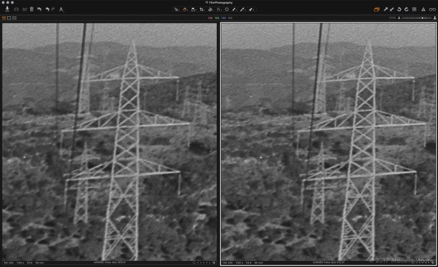 The detail on the distant buildings taken near the centre of the film is clearly much better with the higher resolution, where you can make out the details of the balconies and windows. The advantage falls off towards the edge of the image, partly due to the film not being completely flat and partly because of some edge softness and increased chromatic aberration from the macro lens.