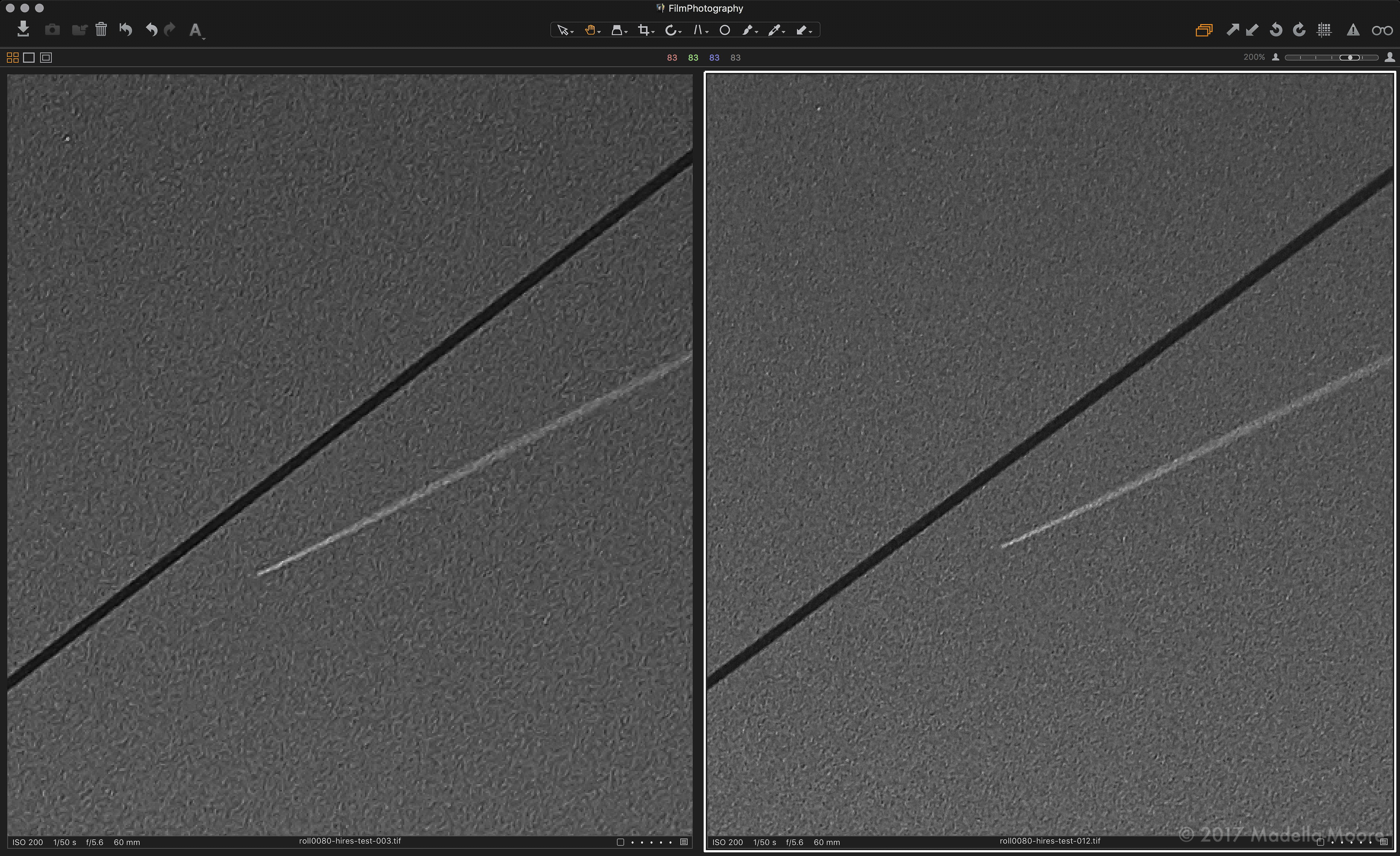 The detail on the distant buildings taken near the centre of the film is clearly much better with the higher resolution, where you can make out the details of the balconies and windows. The advantage falls off towards the edge of the image, partly due to the film not being completely flat and partly because of some edge softness and increased chromatic aberration from the macro lens.