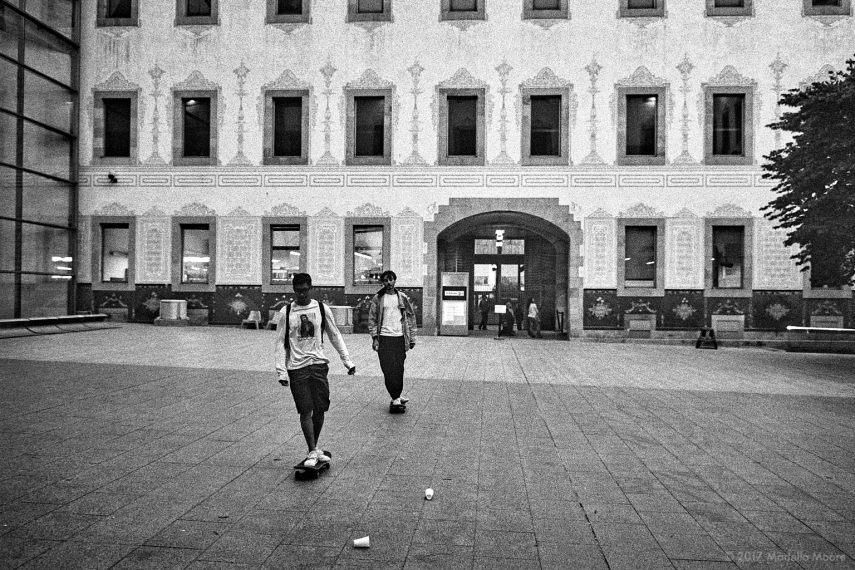 Medium-light (dusk) image shot inside the courtyard of the CCCB, Barcelona. This was taken using the same lens as the previous shots, but this time with a deep red filter fitted. The combination of the filter and the light seems to make the grain more prominent. I think that the overall image “look” is still quite good, however.