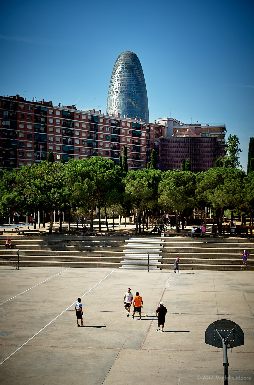 Torre Glòries, seen from the Parc del Clot, Barcelona. If everyone seems to be playing football around the tower, that might be because the tower’s default colours are those of FC Barcelona…