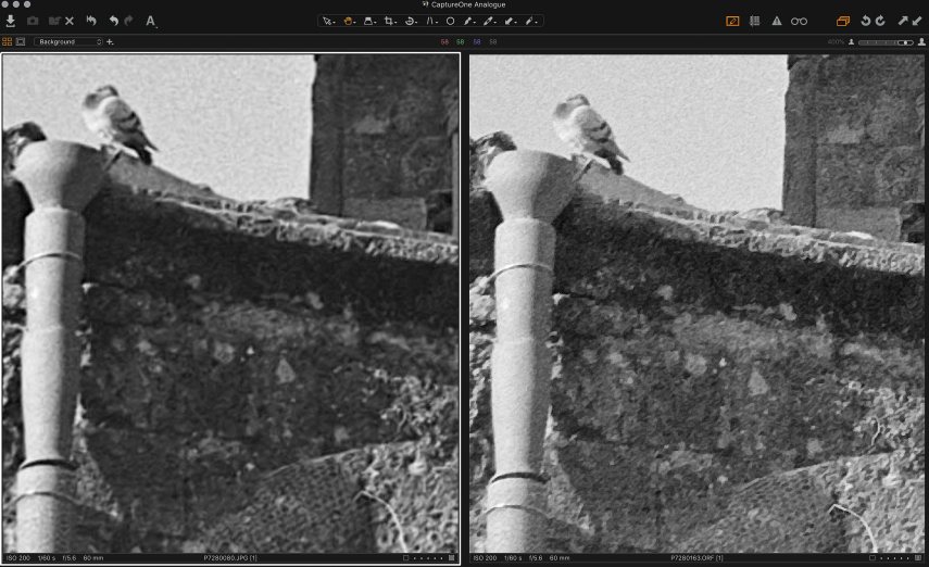 The following screen shots show larger crops in Capture One, paired with the single-shot on the left vs the sharpened hi-res shot on the right. The improvement with high-resolution mode is clear, and attempts to adjust the sharpening of the single-shot mode are unable to close the gap: