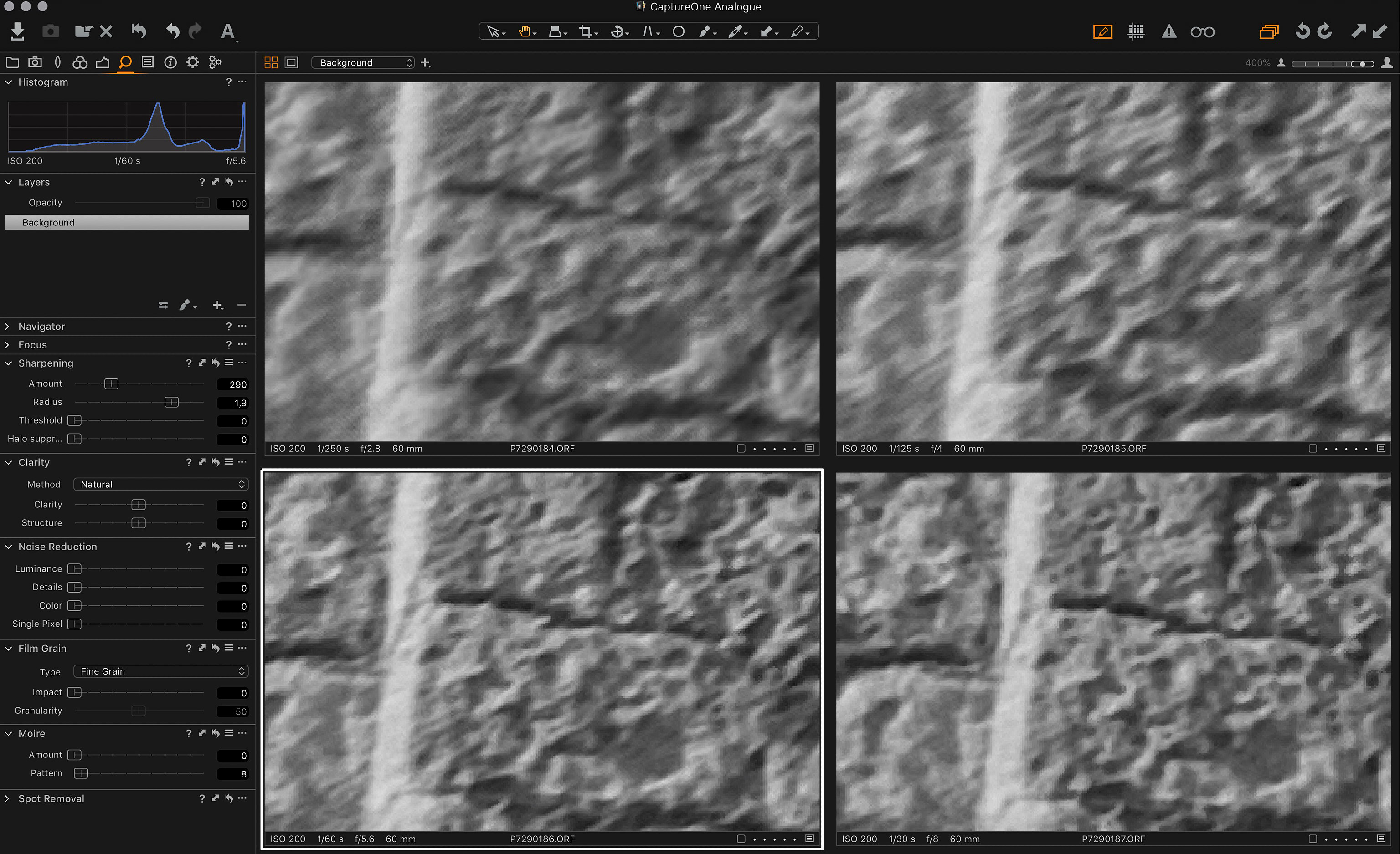 - for best resolution and dynamic range, use 80MP high-resolution RAW files taken at f5.6, and use heavy sharpening in Capture One