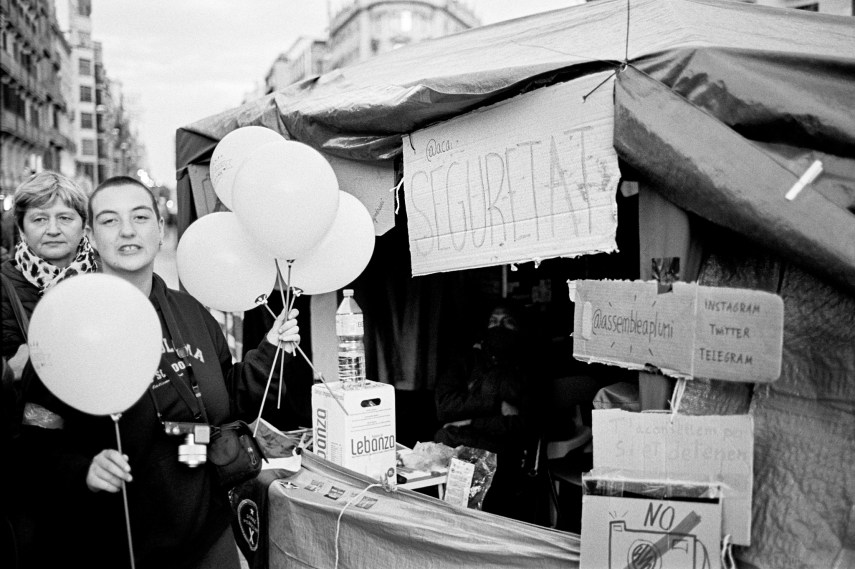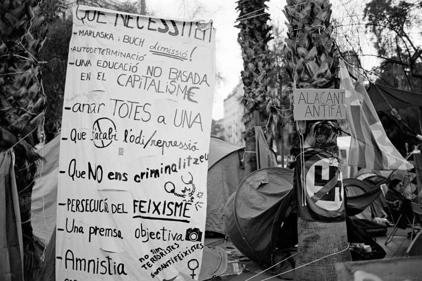 The aims of the protest were many and varied, but could be summarised as a set of anti-fascist goals. The difficulty with this, however, is that for these groups in Catalunya, the definition of a fascist is essentially anyone who does not support the independence movement. Similarly, demands for a free and unbiased press ring very hollow given the use of of the Catalan television station, TV3, as a propaganda arm of the regional government. “Unbiased” means in this case “pro-independence”, and it is interesting to contrast this demand with the numerous banners trying to ban photographs of the encampment and a recent local protest by the press themselves against intimidation and violence by people seeking to control the media’s story.