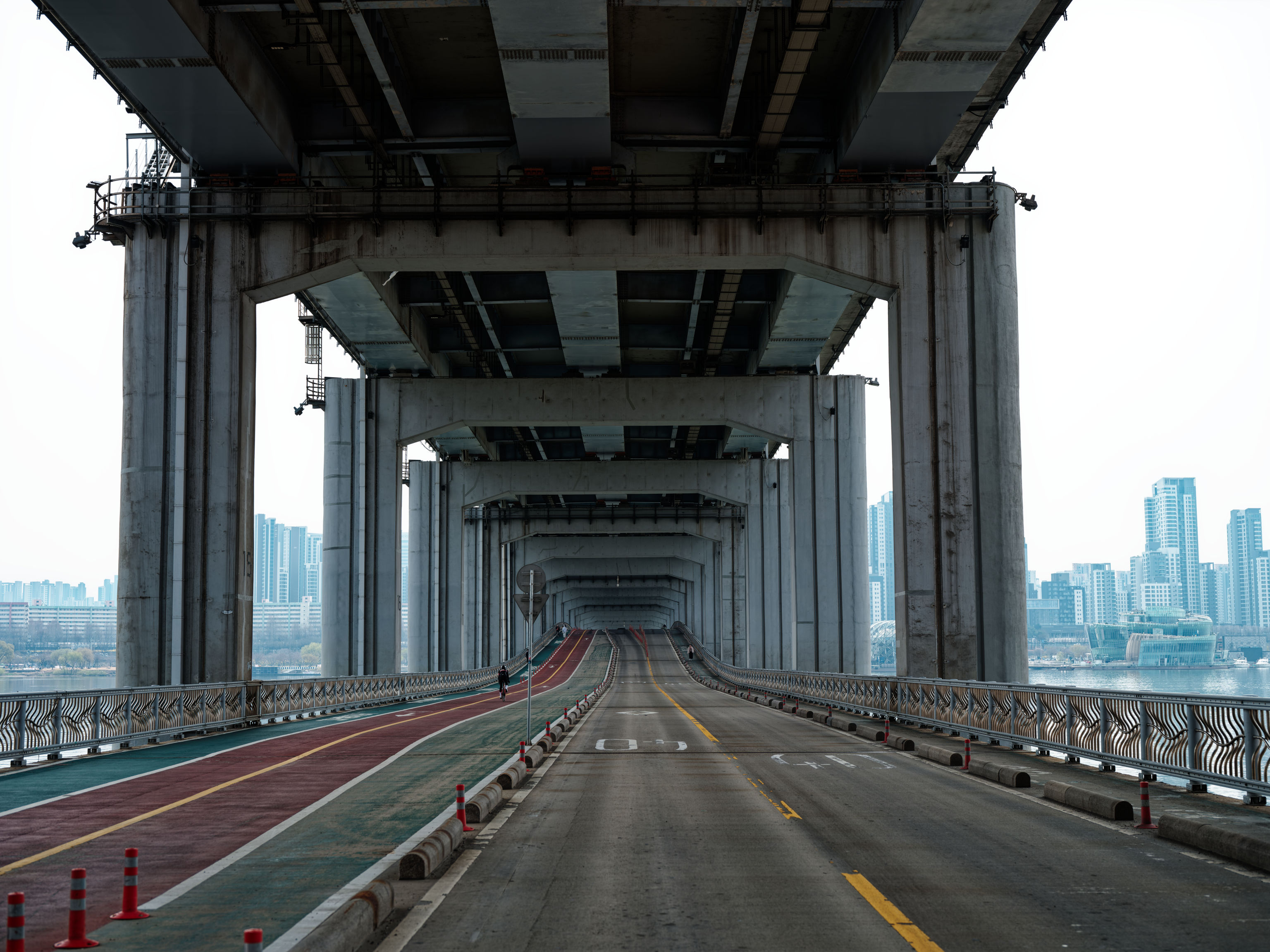 A short set of images taken walking along the banks of the Hangang river in Seoul. This was a particularly rainy and wet time and there were few people around, often giving the illusion of an abandoned city – an illusion that is easily broken if you are just a little higher and can see all the traffic!