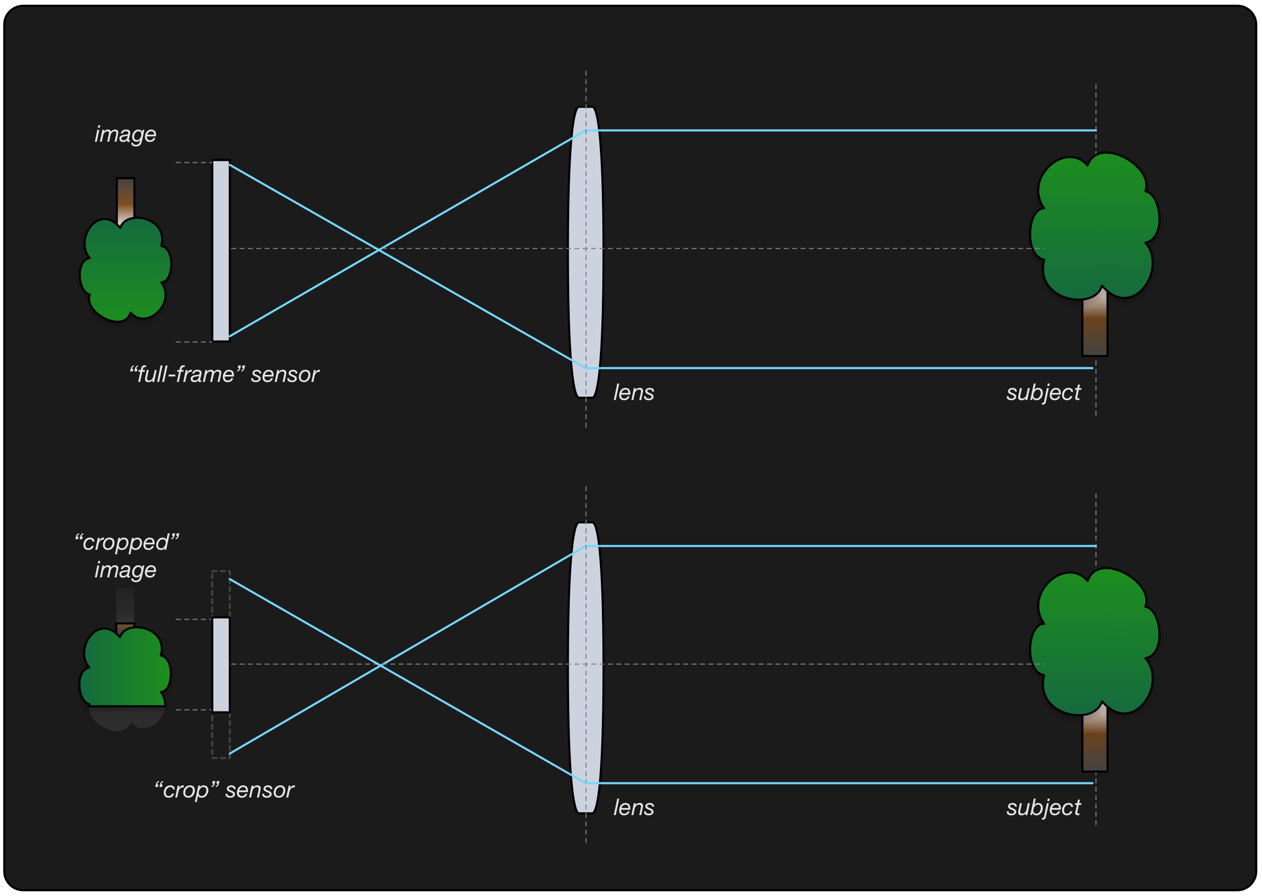 Two diagrams of a camera and lens, one with a full-frame sensor the other with a crop-sensor.