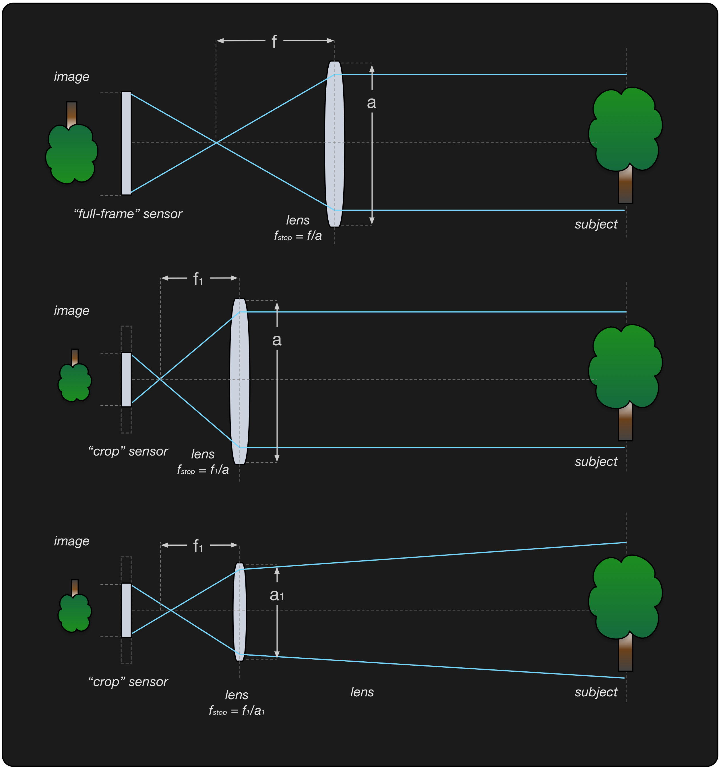 The following diagram shows three potential configurations. In the first, the reference “full-frame” configuration is shown. In the second, a crop-sensor configuration with the same same field-of-view and the same total light gathering capacity is shown, and in the third a crop-sensor configuration with the same field of view and f-stop as the full-frame sensor.