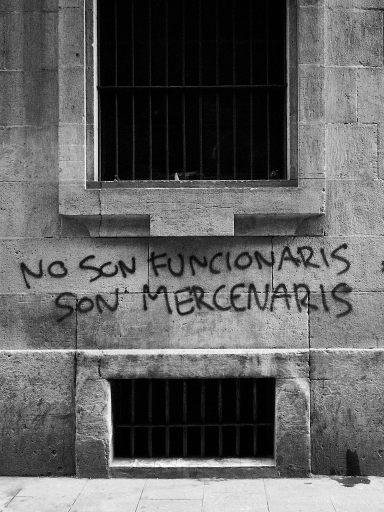 The title comes from graffiti seen on a wall, “No son funcionaris, son mercenaris” – which roughly translates as “They are not officials, they are mercenaries”. In Spain, to be a funcionario – an official of the state – is often aspired to in the highest of terms. A permanent job, well paid, and where dismissal is almost impossible. The lives of many of those that live in the centre of Barcelona sometimes feel as far removed from that aspiration as could be possible.