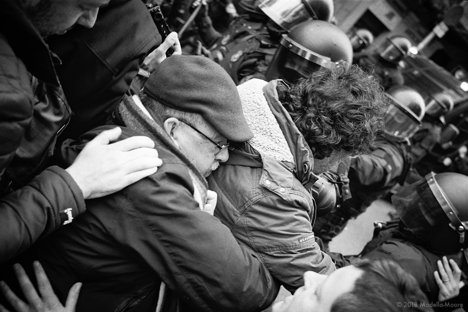 Most of the people at the protests are not violent, but there is a serious risk of injury from crushing or panic in densely packed confrontations such as this. Carrer de València, Barcelona.