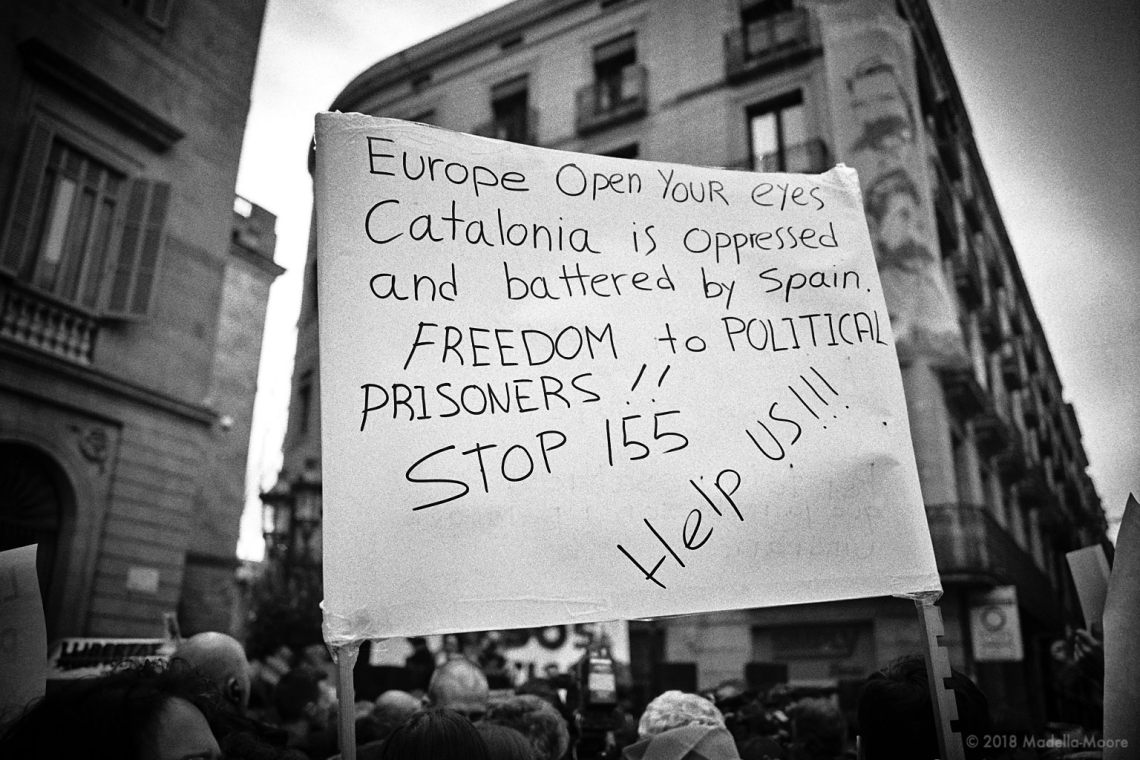 Independence campaigners with banners in English working an international media campaign to portray Catalonia as an oppressed nation.