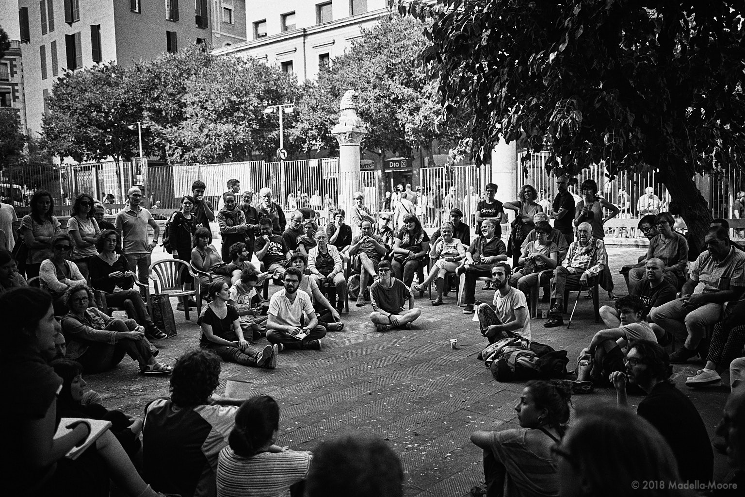 CDR round-table meeting in a school prior to the referendum. The group is discussing how to deal with possible police action to close down the polling, and also how to maximise international media coverage to support the independence movement. Sant Pau del Camp, Barcelona.