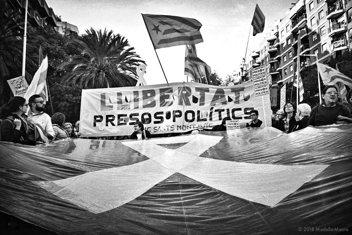 Banner calling for the release of the politicians jailed on remand following the events of the referendum and unilateral declaration of indpendence. The use of the phrase “political prisoners” is an example of propoganda designed to advance the portrayal of Catalonia as an oppressed nation. Carrer de la Marina, Barcelona.