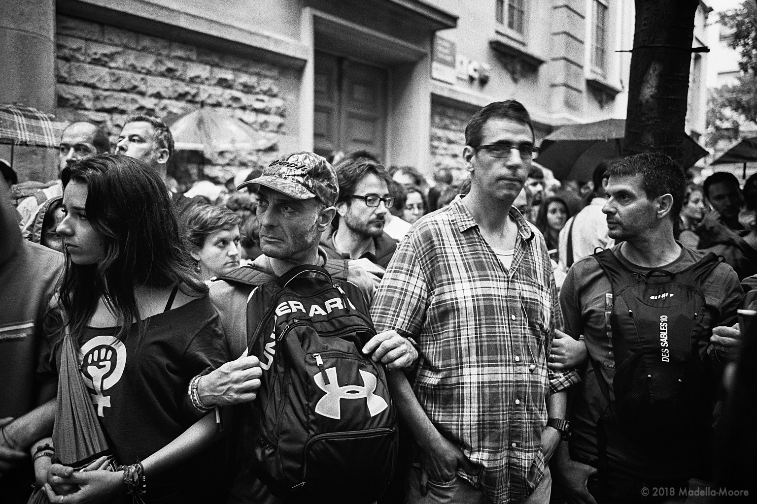 People forming a human shield around a polling station, with the intention of preventing police from closing it down during the independence referendum of 1st October. Catalan regional police monitored the station throughout the day, but took no action and were cheered by the crowd when the eventually left. Carrer dels Angels, Barcelona.