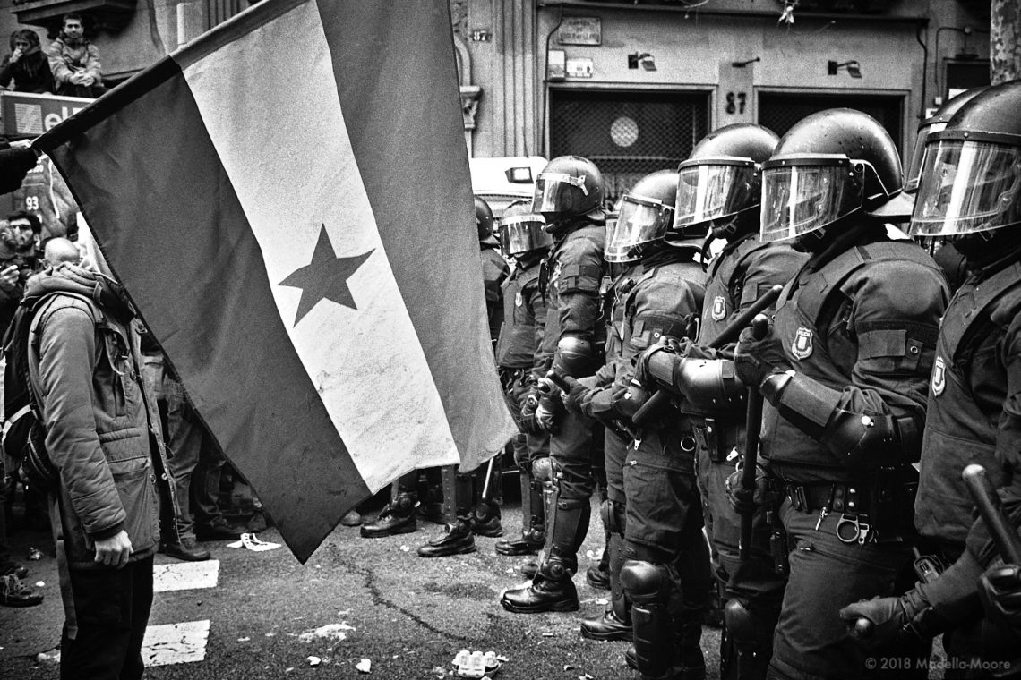 Protesters and Catalan police clash following the arrest of Carles Puigdemont in Germany. The protesters are trying to reach the Delegación del Gobierno Español. Carrer de València, Barcelona. The flag is a far-left variant of the flag of the 2nd Spanish Republic.