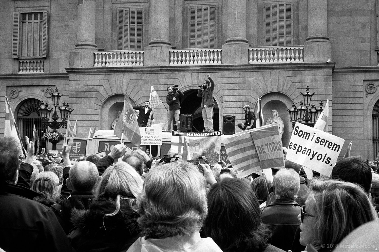 Tabarnian themed anti-independence protest. Unlike the professional and well financed pro-independent events which use professional stage equipment, the campaigners here are presenting while standing on their van. The city council removed their pro-independence banner for this event, replacing it the following day.