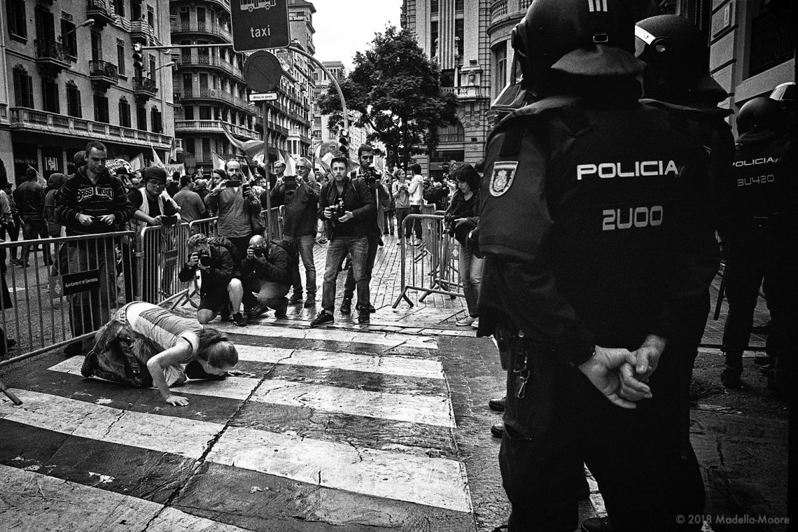 Woman, wrapped in a Spanish flag, kisses the ground at the feet of the Spanish National Police as thanks for their controversial attempts to stop the 1st October independence referendum. Via Laietana, Barcelona.