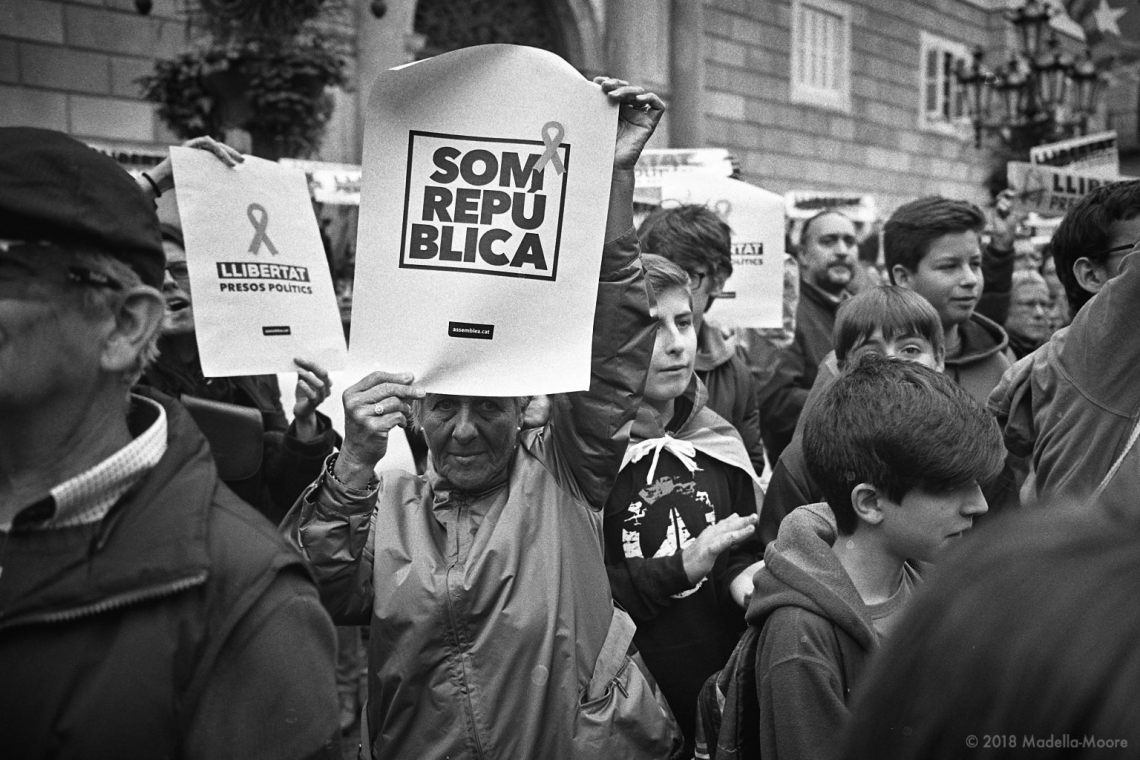Protester, holding a banner proclaiming “we are a republic”. While some government members have claimed that the Catalan independence declaration was only symbolic, a minority of people now regard Catalunya as an independent country that is occupied by Spain.