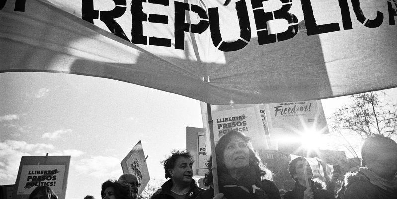Βlack and white film images taken at two Catalan independence protests in Barcelona. The use of Article 155 to suspend autonomous rule in the region has effectively blocked the indirect channeling of government finance (via cultural associations) to support events such as these, with the result that banners are being recycled or even hand made. This is in contrast to the piles of professionally produced posters that were routinely handed out at events earlier in the process. In these images, the protesters are mainly campaigning for two issues: to free […]
